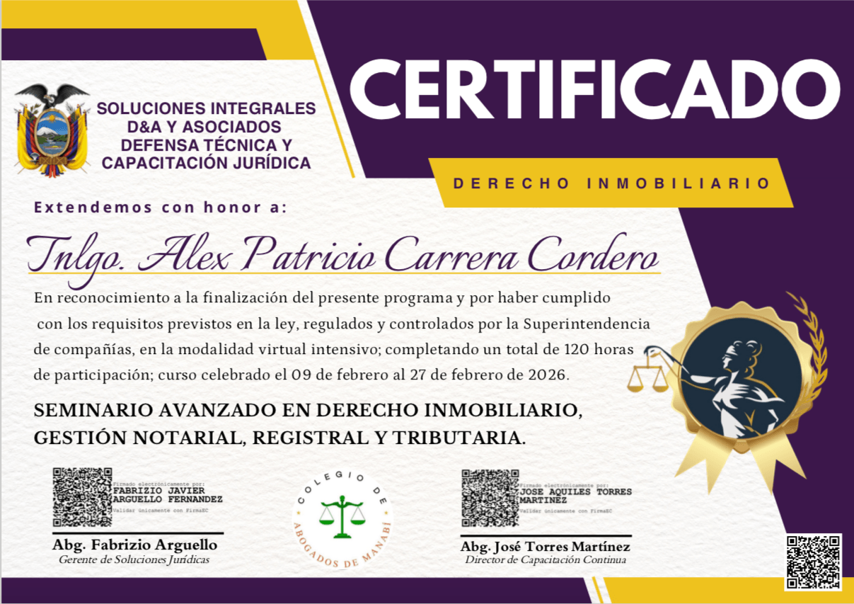 Me certifiqué en los aspectos legales Inmobliarios de gestión contractual, registral y municipal, fideicomiso, sucesiones y riesgo tributarios.